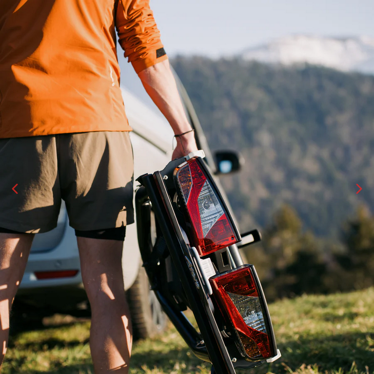 Sklopná funkcia: Nosič má sklopnú funkciu pod uhlom 55° s možnosťou prenastavenia na jedinečných 80°, čo umožňuje ľahký prístup do batožinového priestoru vozidla, aj keď sú bicykle naložené. Tento uhol sklopenia umožňuje otvorenie zadných dverí aj pri vozidlách typu VAN, ako je Volkswagen Transporter/Multivan T5/T6/T7 alebo Mercedes Benz V-klasse.