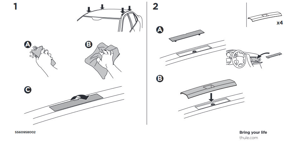 Pro montáž na střechu potřebujete montážní kit Thule, který je součástí dodávky. Montážní kit má přesný rozměr a profilaci tak, aby bezvadně seděl na střeše vozu. Kit se jednoduše vloží do patky a tím se stane součástí patek.